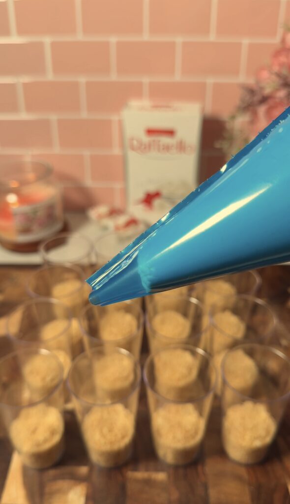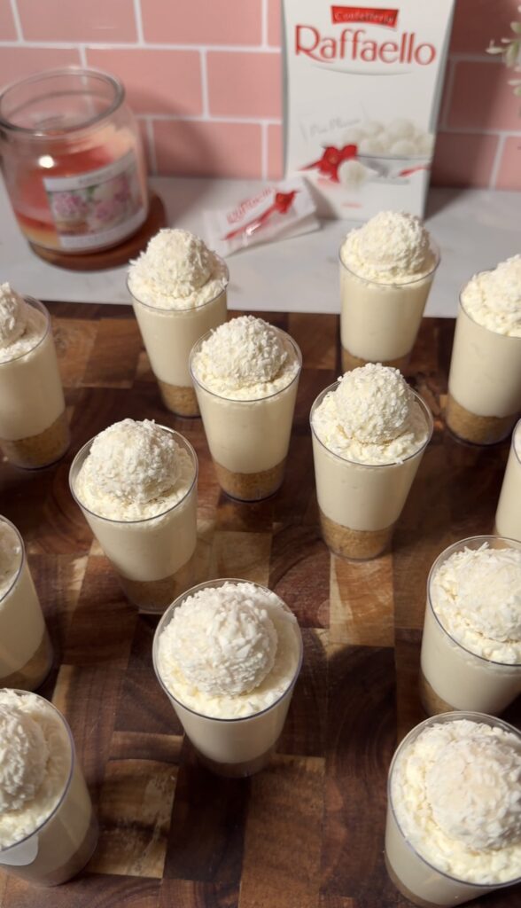 These Raffaello cheesecake cups can be made up to 2 days in advance and stored in the fridge in an airtight container. The texture stays creamy and the biscuit base holds up well.